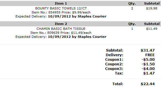 Now through 10/13, Staples is offering the 12 count Bounty Basic Paper Towel for only $7.99. Normally priced at $11.99, that works out to be 67¢ per roll. Plus, shipping is free!! This price is good in-store, online or by phone.