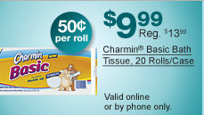 They also had a pretty good deal on Charmin® Basic Bath Tissue Rolls, 1-Ply, 20 Rolls/Case for just $9.99. Normally priced at $13.99, that works out to be just 50¢ per roll. Plus free shipping as well! This price is only good online or by phone.